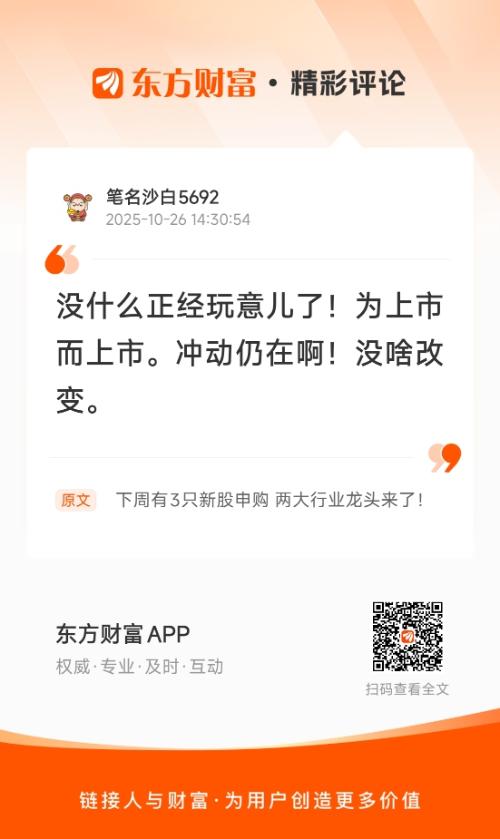 没什么正经玩意儿了!为上市而上市。冲动仍在啊!没啥改变。 我在《下周有3只新股申购两大行业龙头来了!》的评论获得了大家的关注。