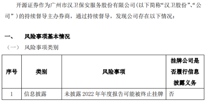 公告 汉卫股份:开源证券关于广州市汉卫保安服务股份有限公司未按规定披露2022年年度报告可能被终止挂牌的风险提示性公告