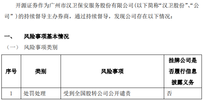 公告 汉卫股份:开源证券关于广州市汉卫保安服务股份有限公司及相关责任主体收到全国股转公司纪律处分决定的风险提示性公告