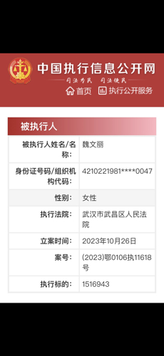 经查询“中国执行信息公开网”,目前魏文丽还没有被纳入失信被执行人名单,说明还有清偿能力。但是蛋糕就这么大,投资人那么多,作为投资人之一的你,被动等待魏文丽主动清偿,会清偿吗?能回款多少?主动出击才能提高回款可能性和增加回款数额。