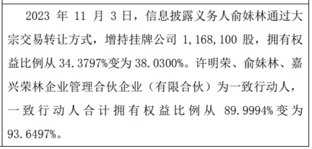 荣林环境股东俞妹林增持116.81万股 权益变动后直接持股比例为38.03%