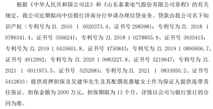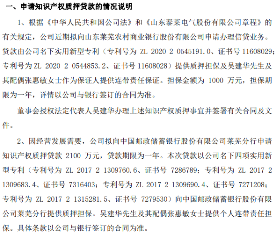 泰莱电气拟向银行申请2000万贷款 公司以名下知识产权提供质押担保