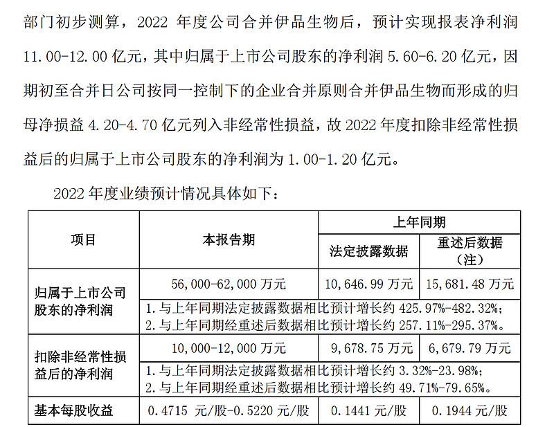 转载自“后来居上_Dioyan”原创文章去年完成“蛇吞象”资本运作、成功并购伊品生物的星湖科技(600866.SH),近日披露了业绩预报,预计2022年度实现报表净利润11亿元至12亿元,与2021年数字相比增幅超过10倍;其中归属于上市公司股东的净利润5.60亿元至6.20亿元,与2021年同期(法定披露数据)相比增幅超过4倍,实现了巨幅的增长。很显然,星湖科技2022年业绩增长背后,一方面得益...
