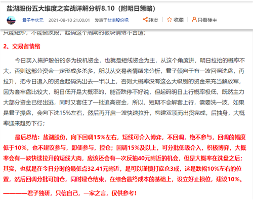 君子在8月10日盐湖股份上市首日晚,发布了对盐湖股份的全面实战详解分析,今日走势兑现了君子的几乎全部预测分析,近乎神准预测,今日君子也是知行合一,几乎全天最低价附近买入正T仓,顺利低吸反打板,操作的还算满意!虽然没有挖掘运作的华菱电力更出彩,但也还不错了!这篇文章同时发布在全网,让上万铁粉见证了这篇文章的价值,祝贺参阅文章且知行合一的四海股友们!