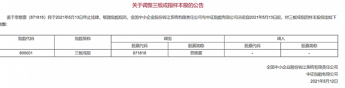 资讯 中证指数有限公司:将思格雷调出三板成指样本股