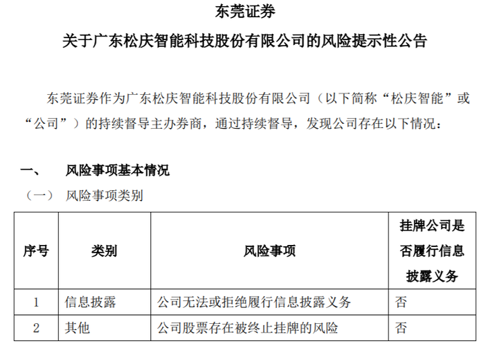 公告 松庆智能:东莞证券关于广东松庆智能科技股份有限公司的风险提示性公告