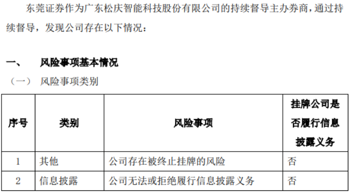 松庆智能存在被终止挂牌的风险 无法或拒绝履行信息披露义务
