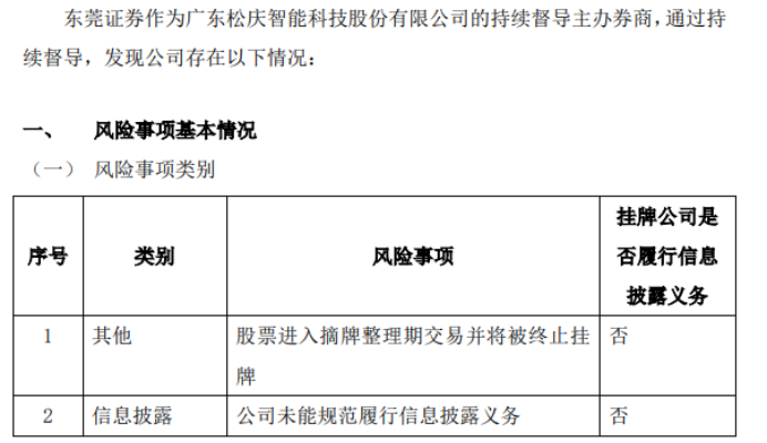 公告 松庆智能:东莞证券关于广东松庆智能科技股份有限公司股票进入摘牌整理期交易并将终止挂牌的第一次风险提示性公告