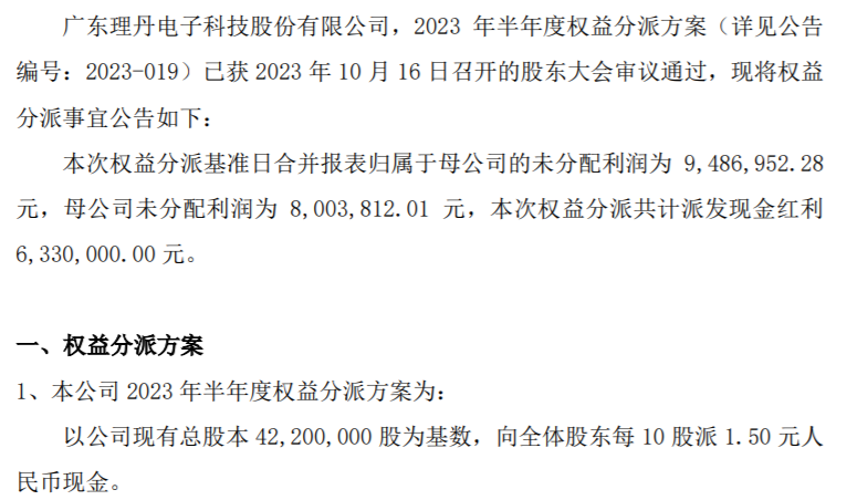 理丹电子2023年半年度权益分派每10股派现1.5元 共计派发现金红利633万元