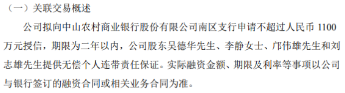 理丹电子拟向银行申请不超过1100万授信 股东吴德华、李静、邝伟雄和刘志雄提供无偿个人连带责任保证
