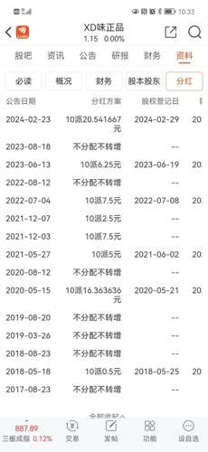 挖贝网2月23日,味正品康(872022)近日发布2023年半年度权益分派实施公告,公司2023年年度权益分派方案为:以公司现有总股本24,000,000股为基数,向全体股东每10股派20.541667元人民币现金。本次权益分派基准日未分配利润为49,353,579.26元,不存在纳入合并报表范围的子公司。本次权益分派共计派发现金红利49,300,000.00元。公司披露2023年度报告显示,20...