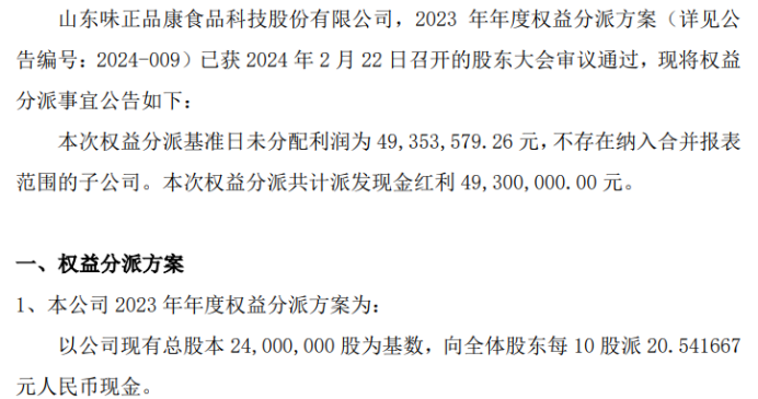 公告 味正品康:2023年年度权益分派实施公告
