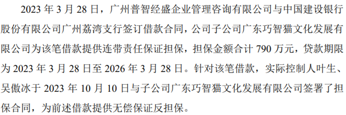 晔生科技子公司广东巧智猫文化发展有限公司为广州普智经盛790万的借款提供无偿保证反担保