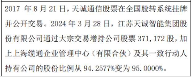 天诚通信股东增持37.12万股 权益变动后直接持股比例为89.86%