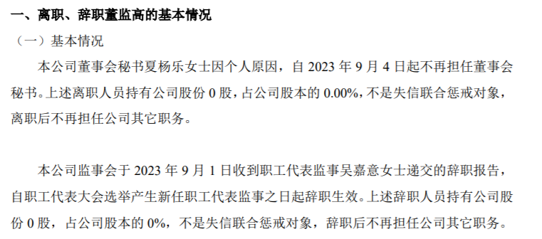 挖贝网9月4日,ST卡联股(872168)发公告称,公司董事会秘书夏杨乐女士因个人原因,自2023年9月4日起不再担任董事会秘书。上述离职人员持有公司股份0股,占公司股本的0.00%,不是失信联合惩戒对象,离职后不再担任公司其它职务。公司监事会于2023年9月1日收到职工代表监事吴嘉意女士递交的辞职报告,自职工代表大会选举产生新任职工代表监事之日起辞职生效。上述辞职人员持有公司股份0股,占公司股本...