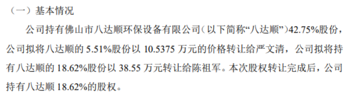 挖贝网6月16日,迈光科技(872281)近日发布公告,公司持有佛山市八达顺环保设备有限公司(以下简称“八达顺”)42.75%股份,公司拟将八达顺的5.51%股份以10.5375万元的价格转让给严文清,公司拟将持有八达顺的18.62%股份以38.55万元转让给陈祖军。本次股权转让完成后,公司持有八达顺18.62%的股权。公司2022年度经审计的合并财务会计报表期末资产总额为38,184,314.9...