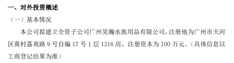 迈光科技拟投资100万设立全资子公司广州昊瀚水族用品有限公司