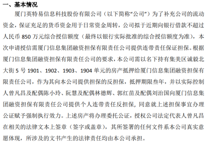 英特易拟向银行申请不超过850万借款 公司以名下持有集美区诚毅北大街房产抵押