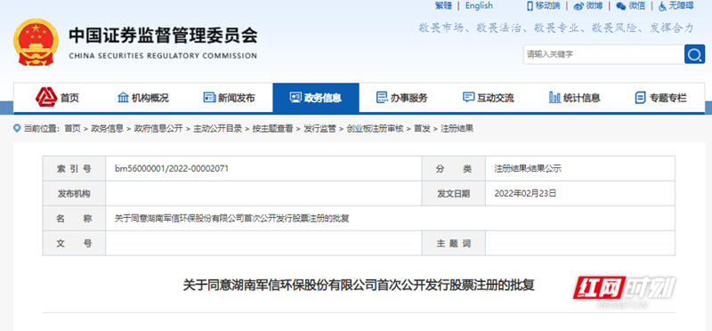 $军信环保(SZ872664)$军信环保获IPO批文有望成为2022年首只湘股2022-02-2323:41:05图源中国证监会官网。红网时刻2月23日讯(记者甘红)湖南资本市场迎来虎年开门红!据中国证监会官网2月23日晚间信息,湖南军信环保股份有限公司(以下简称军信环保)首次公开发行股票注册申请已获得中国证监会批准。值得一提的是,军信环保是湖南发布企业上市“金芙蓉”跃升行动计划后,首家...