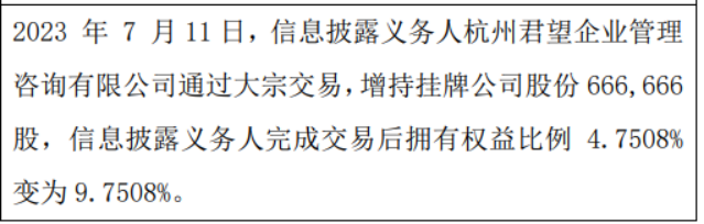 挖贝网7月12日,研几网络(872702)发公告称,2023年7月11日,信息披露义务人杭州君望企业管理咨询有限公司通过大宗交易,增持挂牌公司股份666,666股,信息披露义务人完成交易后拥有权益比例4.7508%变为9.7508%。据了解,信息披露义务人杭州君望企业管理咨询有限公司通过全国中小企业股份转让系统以大宗交易方式增持公司流通股导致权益变动,不涉及相关协议、行政划转或变更、法院裁定等文件...