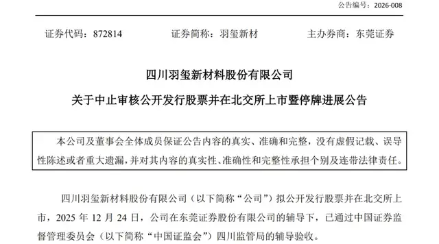 4月1日,四川羽玺新材料股份有限公司(下称“羽玺新材”)$羽玺新材(SZ872814)$公告,公司因财务报告到期补充审计事项申请中止IPO审核,并获北京证券交易所(下称“北交所”)批准。 拟募资2.1亿元 因财务报告“超期”中止IPO 2025年12月31日,北交所正式受理羽玺新材向不特定合格投资者公开发行股票并在北交所上市的申请。 此次IPO,羽玺新材拟公开发行不超过2700万股,募集资金2.1...
