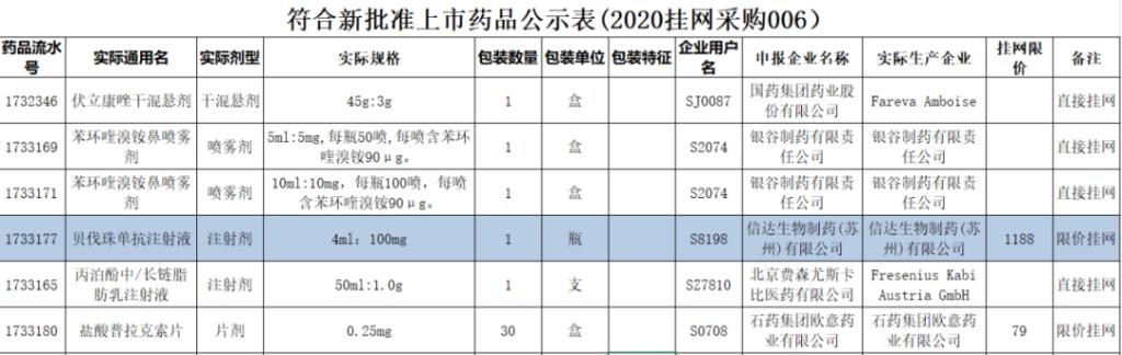 7月10日,陕西省公共资源交易中心发布《关于新批准上市药品相关信息的公示》,公布了25个药品符合新批准上市药品的相关信息,其中包括不久前上市的信达生物贝伐珠单抗注射液,挂网价格为1188元/瓶(4ml:100mg)。6月19日,信达生物制药(苏州)有限公司的贝伐珠单抗注射液获批上市,信达生物成为国内该品种生物类似药在齐鲁制药之后第二家获批的企业。贝伐珠单抗是利用重组DNA技术制备的一种人源...