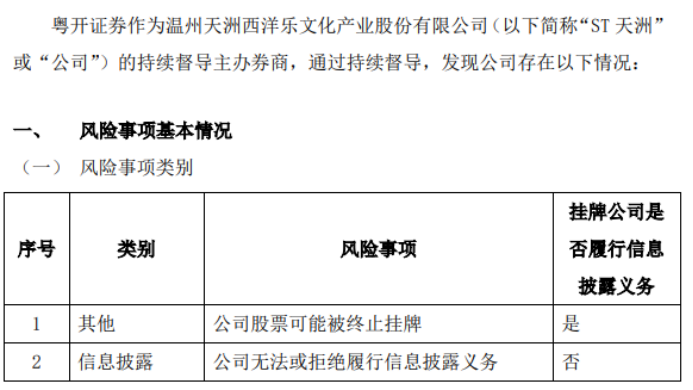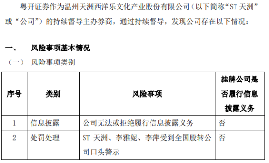 公告 ST天洲:粤开证券关于温州天洲西洋乐文化产业股份有限公司的风险提示性公告