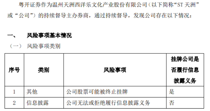 公告 ST天洲:粤开证券关于温州天洲西洋乐文化产业股份有限公司可能被终止股票挂牌暨停牌进展的风险提示性公告