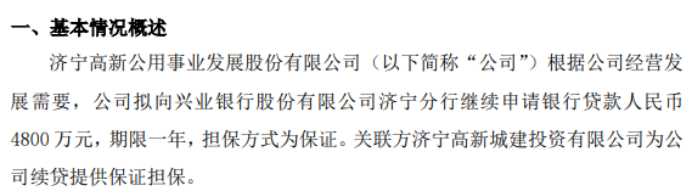 高新公用拟向银行申请4800万贷款 关联方济宁高新城建投资有限公司为公司续贷提供保证担保