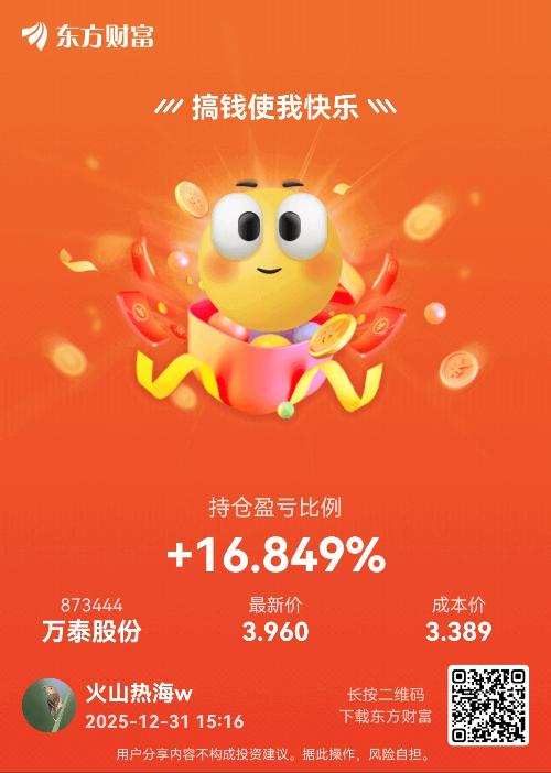 $万泰股份(SZ873444)$大盘涨这么好,买个100股,一起涨,喜庆