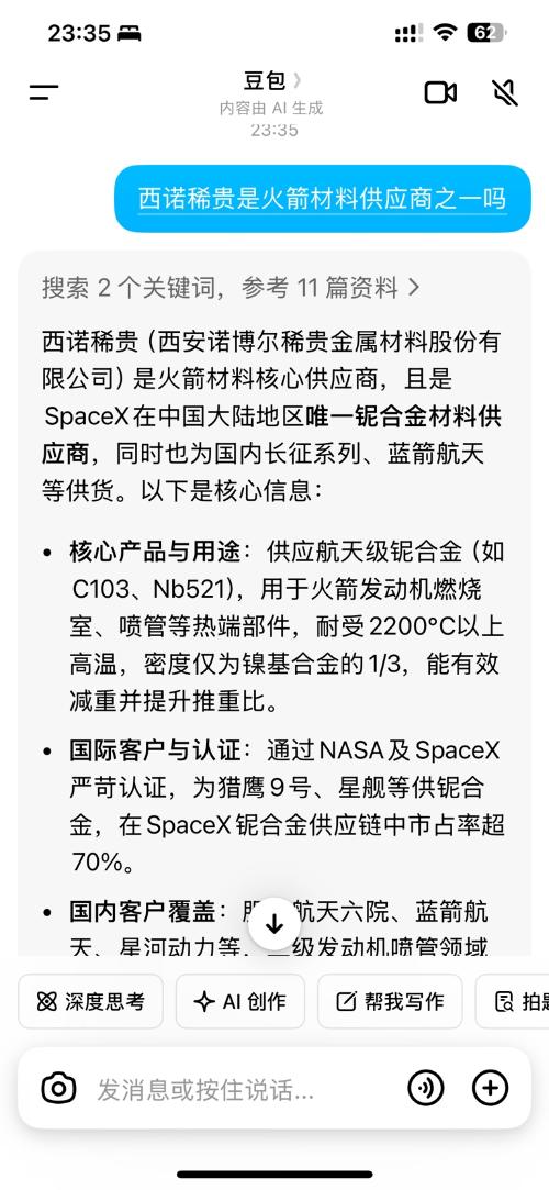 铌钽+核聚变+SpaceX $西诺稀贵(SZ873575)$星链概念:稀有难熔金属(钽、铌),境内铌合金材料唯一供应商,产品用于猎鹰9号、星舰发动机燃烧室与喷管延伸段,耐受2200℃高温,单箭价值500-1000万元,占SpaceX铌合金供应链70%以上份额。还有核能概念:核反应堆堆芯核心材料。还有贵金属概念:金、银、铂、钯等,一共三大概念助推稀贵百元股加油!