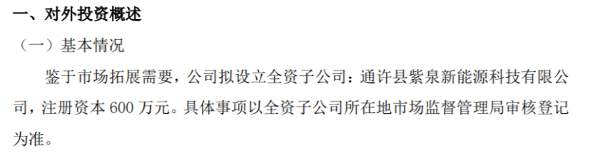 紫泉能源拟投资600万设立全资子公司通许县紫泉新能源科技有限公司
