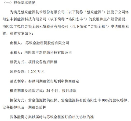 紫泉能源控股子公司洛阳宏丰拟向苏银金租申请融资租赁 融资金额1200万