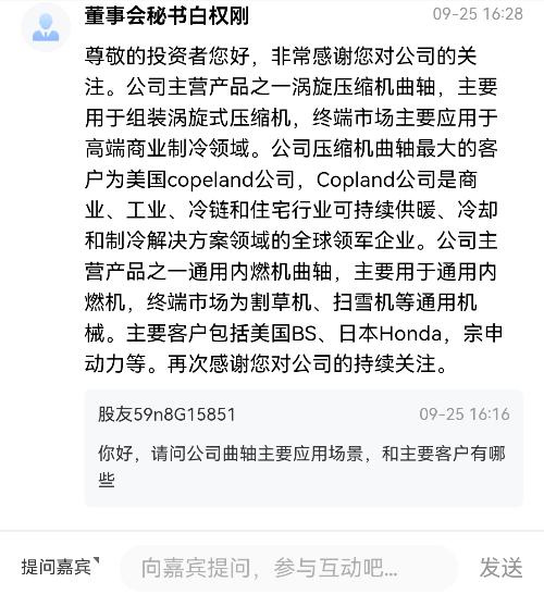 【问】贵司柴发业务开展如何【答】美心翼申:尊敬的投资者您好,非常感谢您对公司的关注。公司有生产柴油发动机曲轴。再次感谢您对公司的持续关注。