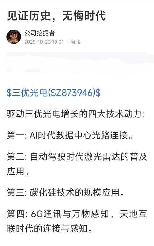 $三优光电(SZ873946)$$鸿辉光通(SZ832063)$$置富科技(SZ838696)$ 2025年秋天,科普三优光电、置富科技的成长逻辑,没什么用,股价下跌,有人ma我,小散就是小散,情绪化没好处。 三优光电、置富科技继续持股。 鸿辉光通,停止出售子公司鸿辉光联后,我加大了鸿辉光通的仓位。 这三个公司,钱途看好。 这三个股票已经走好,以后我就可以少说话了。 涨跌随意,淡定持股。
