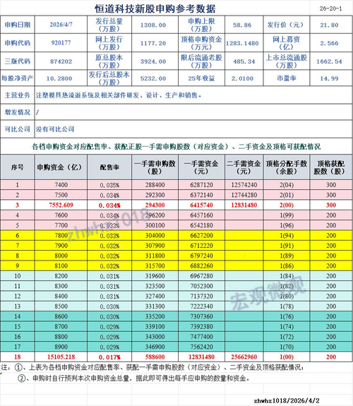 $恒道科技(SZ920177)$$恒道科技(SZ874202)$ 2026年第20只新股【恒道科技】(代码920177)将于4/7(周二)网上申购,本次发行的【恒道科技】公司位于浙江省绍兴市柯桥区,主营业务:注塑模具热流道系统及相关部件研发、设计、生产和销售。本次发行总量:1308万股,本次网上发行量:1177.20万股(战投10%),发行价21.80元,申购上限58.86W股,顶格资金1283....
