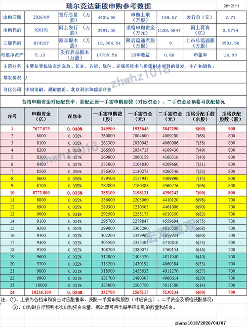 $瑞尔竞达(SZ874327)$$恒道科技(SZ920177)$ $赛英电子(SZ920181)$ 瑞尔竞达将于2026年4月9日(周四)发行,申购代码920191,发行价7.71元,发行市盈率14.99倍,网上发行量3991.50万股,顶格申购上限199.57万股,需资金1538.68万元。公司经限售后无流通老股,历史数据显示未限售流通老股数量对北交所新股上市首日涨幅呈显著负向影响。 参考近期北...