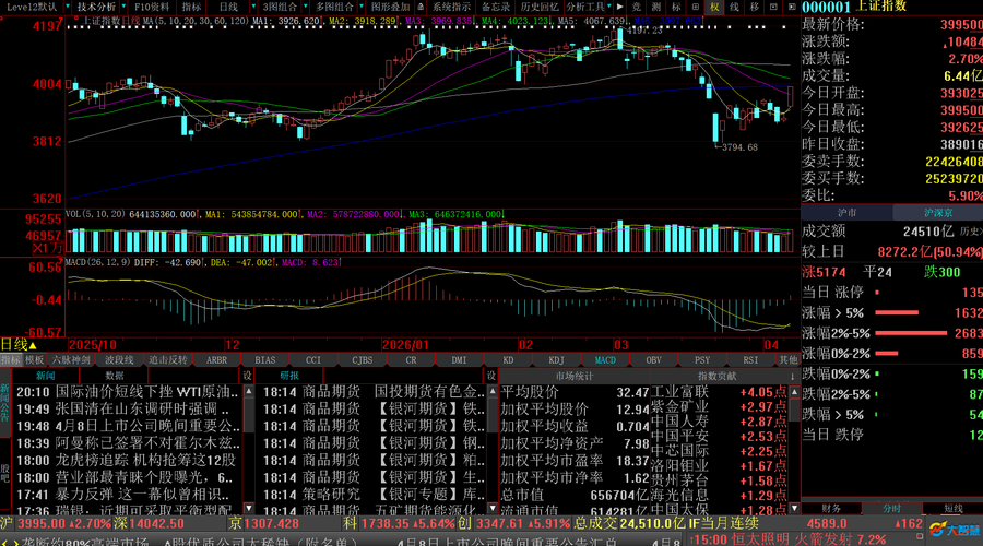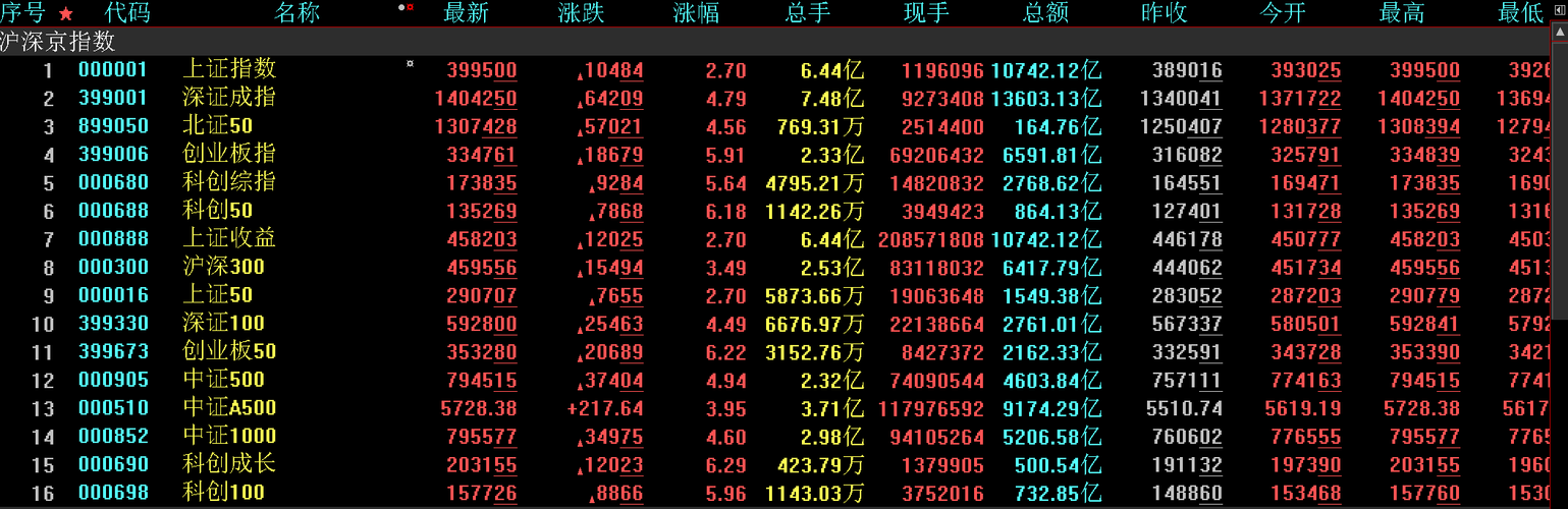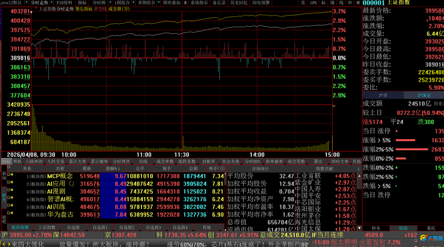 $恒道科技(SZ920177)$$N晨光(SZ920011)$$瑞尔竞达(SZ920191)$ 4月8日,随着中东战事双方都“赢”了,全球股市都开始上涨,大A也终于硬气了一回,沪指大涨超百点,逼近4000点大关,深指创业板指数大幅走高,截至收盘,沪指涨2.7%收于3995点,深成指涨4.79%,创业板综指涨5.43%,科创综指涨5.64%。个股涨多跌少,上涨5174家,下跌306家,市场平均股价上...