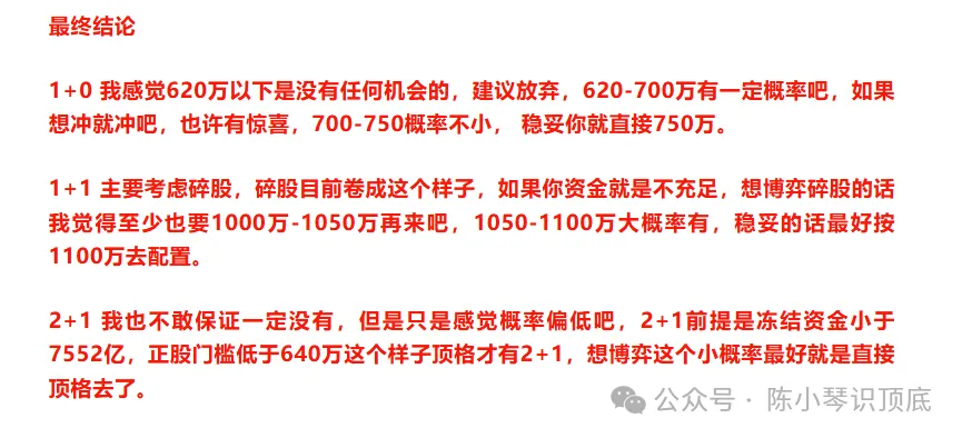 根据目前所知数据 1+0700万以上都有 1+1805万以上都有 顶格无2+1顶格只有1+1 由于博弈1+0的人特别少,目前最低正股门槛到底是多少数据不太清晰 冻结资金应该在7600亿-8300亿之间这个样子 本次正股门槛还算正常吧,碎股门槛突然又离奇的低 创达新材顶格申购的超过4.5万户,也就是1086.3万户这个数量首次破4.5万户记录,以前从来没有这么多的大资金账户,但这次恒道科技这些大账户...