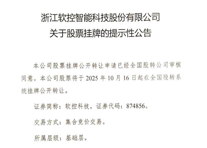 公告 软控科技:关于公司股票将在全国股份转让系统挂牌公开转让的提示性公告