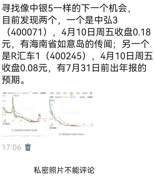 寻找像中银5一样的下一个机会,目前发现两个,一个是中弘3(400071),4月10日周五收盘0.18元,有海南省如意岛的传闻;另一个是R汇车1(400245),4月10日周五收盘0.08元,有7月31日前出年报的预期。以上观点不构成投资建议,投资需谨慎,责任结果自负!#周末杂谈#