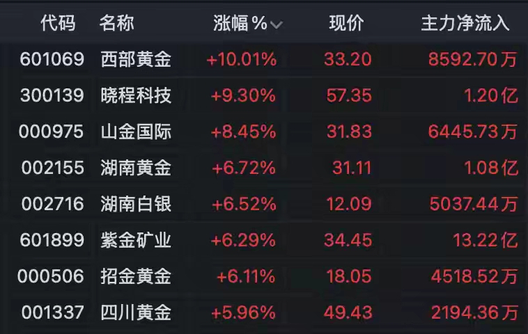 盘面上,有色、半导体、通信设备、元器件等板块涨幅居前;石油、煤炭、多元金融、供气供热等板块跌幅居前。 黄金股爆发 盘初,贵金属概念股集体走强,黄金股大涨。西部黄金涨停,山金国际、湖南黄金、紫金矿业、招金黄金、四川黄金等多股涨超5%。消息面上,今天早盘,金银价格拉升,现货黄金一度站上4850美元/盎司,日内涨逾3%。