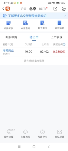 $海昇药业-W(SZ889998)$尊敬的客户:您好,您尾号0666的证券账户申购的北交所新股海昇药业(889998)已获得配售200股,配售金额3980元。新股申购未获得配售部分的缴款将在晚间清算后予以解冻。此消息根据中签配号信息匹配提前发送,具体以交易系统中签查询结果为准。如有疑问,请联系客服95357。
