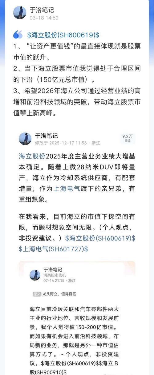 $海立股份(SH600619)$ 1、“让资产更值钱”的最直接体现就是股票市值的跃升。 2、当下海立股票市值我觉得处于合理区间的下沿(150亿元总市值)。 3、希望2026年海立公司通过经营业绩的高增和前沿科技领域的突破,带动海立股票市值攀上新高峰。 (以上内容,非投资建议)$海立B股(SH900910)$