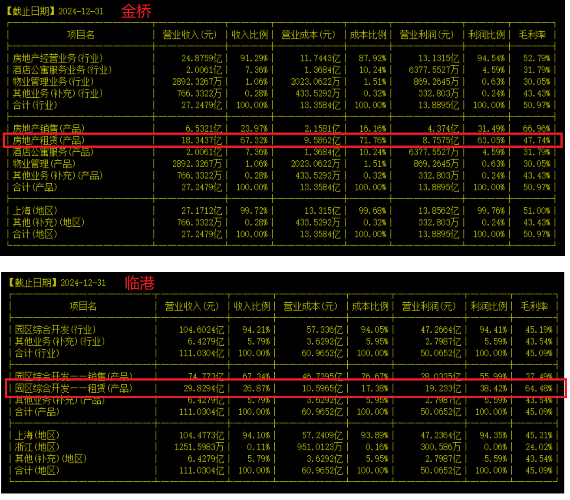 临港涨是价值发现,大飞机等等只要是投资上海基本上都被导入到临港地区,而金桥因为之前的出口加工区定位,现在处于找不到产业方向的状态,由于各种成本不断上升,外资慢慢在撤离,华为也搬走了,从年报租赁毛利数据就可以明显看到,愿意付高租金的企业都走了,现在金桥内有几个国际学校已经很少有洋学生了,另一个影响毛利率的因素是经营管理,这应该也是为什么要换人的原因之一