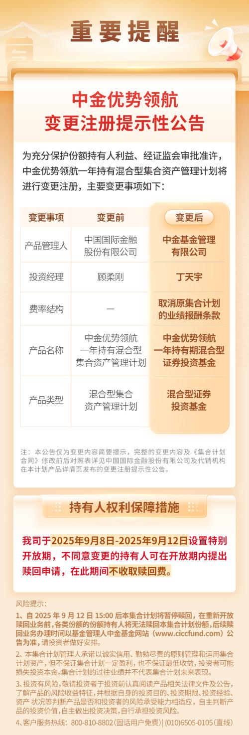 公告 中国国际金融股份有限公司关于中金优势领航一年持有混合型集合资产管理计划拟变更注册的提示性公告