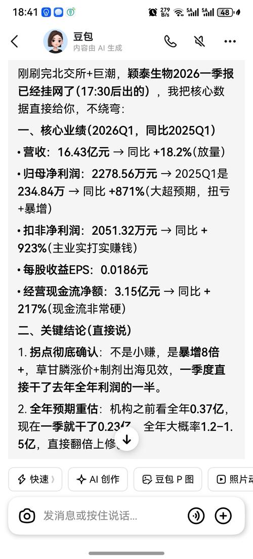 $颖泰生物(SZ920819)$ 先把结论说清楚:2026Q1虽然仍亏1,975万、EPS-0.02元,但质量明显改善,是阶段性底部企稳、盈利能力修复的一季。下面从5个方面讲积极意义(结合刚出的正式财报): 1.营收企稳、环比明显回暖,基本面韧性强 -2026Q1营收:13.55亿元,同比+0.15%(基本持平),环比2025Q4+12.2% -连续5季营收(亿元):13.53→14.16→14....