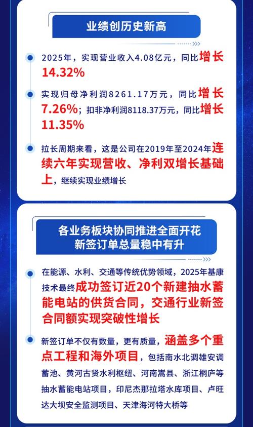 2025年,北交所上市企业基康技术(920879.BJ)业绩再创历史新高,全年实现营业收入4.08亿元,同比增长14.32%;实现归母净利润8261.17万元,同比提升7.26%;实现扣非净利润8118.37万元,较上年同期增长11.35%。 公司在能源、水利、交通等传统领域表现亮眼的同时,加速在风电、核能、油气管道等新兴赛道的布局,已在2025年签订了多个重点工程和海外项目。 在传统优势领域中,...