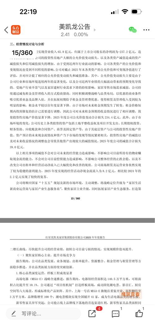 【问】请问美凯龙是否存在债务重压、现金流枯竭、市场需求萎缩、核心资产贬值、账面巨亏和转型无实质突破等多重问题?多重压力叠加下,上市公司何时能走出颓势企稳?【答】美凯龙:感谢您的提问,基于公司已公开披露的信息,现将相关情况说明如下:1.关于债务与现金流:公司正在通过多种方式优化资本结构、积极与金融机构合作保持融资渠道畅通。根据公司2025年年度报告,有息债务规模较稳定,平均融资成本从2024年底的5.2%下降至4.4%左右,2025年财务费用为21.6亿元,较2024年度减少了3.3亿元。经营现金流方面,2025年经营性现金流8.16亿元,同比去年增加6亿元。2.关于市场需求与资产价值:国内家居消费市场短期承压,长期需求稳健,公司投资性房地产(主要为自营商场)采用收益法评估,其价值与未来租金收益预期直接相关。公司通过升级商场、提升运营效率来应对市场变化,致力于维持和提升资产的内在收益能力。3.关于业绩亏损与转型:公司近年来的业绩亏损,主要受投房减值、资产减值及行业周期影响。公司3+星生态、人车家一体化战略等仍在持续推进。转型是一个系统性工程,公司在家电、家装、线上线下一体化等新业务领域已取得初步布局和成效,2025年12月,公司也完成了新五年战略规划,具体进展可参见公司相关公告。当前公司确实面临行业周期与自身转型的双重挑战。企稳向好的具体时间表受宏观经济、行业复苏及公司自身战略执行效果等多重因素影响,存在不确定性。公司目前的首要任务是扎实提升主营业务运营效率,并稳步推进新业务发展。建议您密切关注公司发布的定期报告及公告,以获取最新财务数据与战略进展信息。