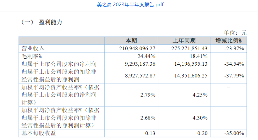 【美之高:上半年营业收入2.11亿元】美之高公布2023年半年度报告,报告期实现营业收入2.11亿元,同比减少23.37%;归属于上市公司股东的净利润0.09亿元,同比减少34.54%;基本每股收益0.13元。公司专注于金属置物架收纳用品的研发、设计、生产和销售。(公司公告)
